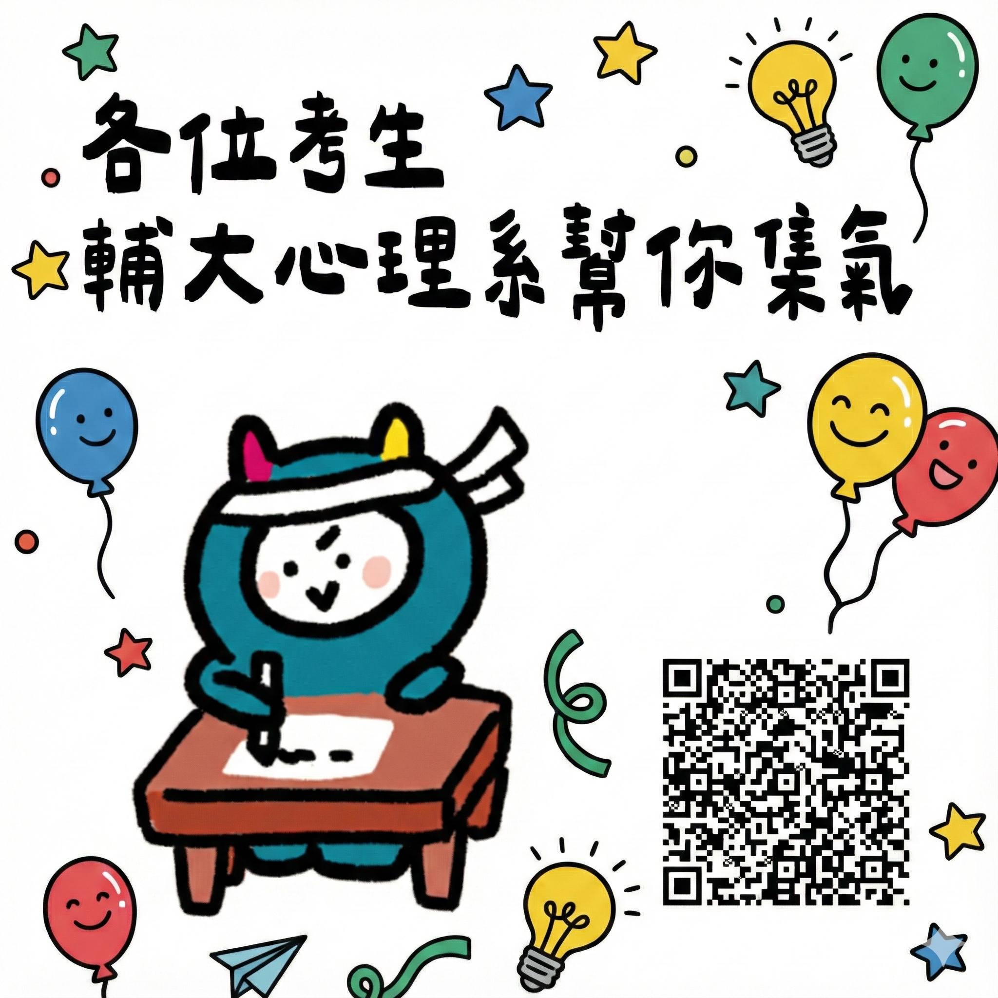另外,因為近年來心理學相關科系非常熱門,我們要鼓勵考生們好好加油,學測第一關非常重要。為了鼓勵大家,我們要幫大家集氣,歡迎填寫這份表單,讓我們幫你集氣。如果你有填寫表單,後來也順利通過個人申請管道進到輔大心理系,我們會送你一個心理系吉祥物的大禮包(含Sora公仔一個、資料夾一個、鑰匙圈一個,還有機會收到吉祥物壓克力立牌一個)。